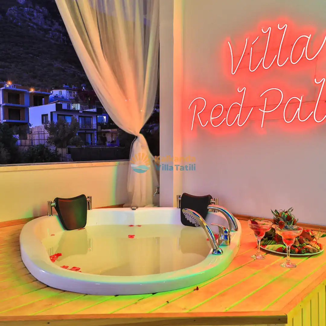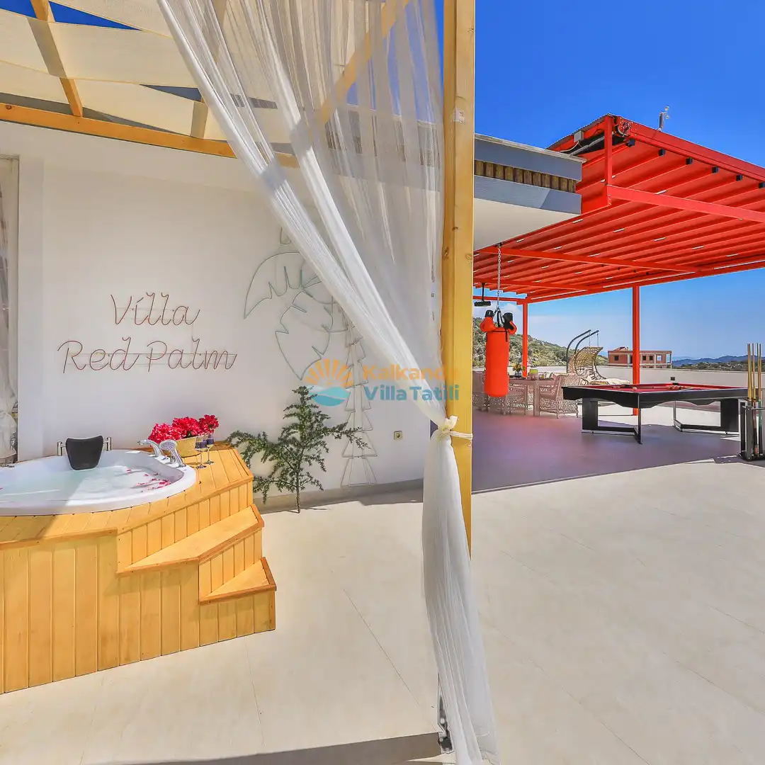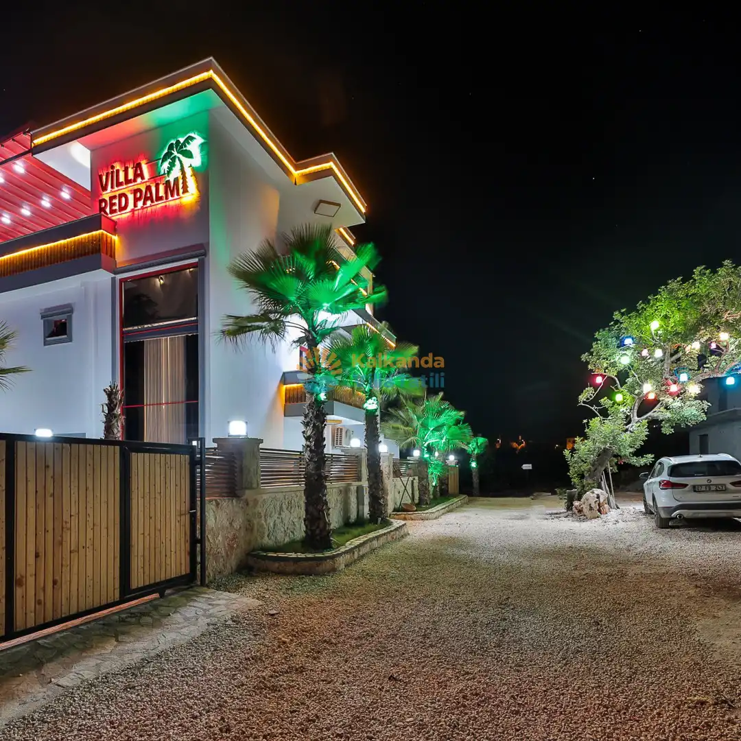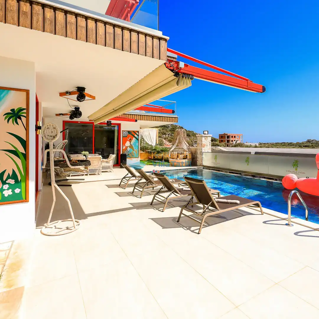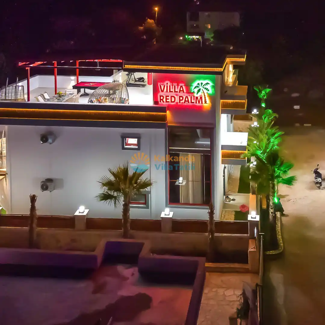 Villa Red Palm , Antalya Kaş bölgesinin Gökseki Mevkiinde bulunmaktadır.Doğa ve Deniz Manzaralı olup , 3 katındada ayrı bir konforla müşterilerimize  en iyi konforu sağlamaktadır. 6 Kişi kapasiteli olup 3 banyo 3 yatak odası mevcuttur . Geniş aileler için özenle tasarlanmıştır . Kiralık villamızın içersinde (masa tenisi, bilardo masası,  jakuzi, ,spor aletleri, sinema sistemi) bulunmaktadır.